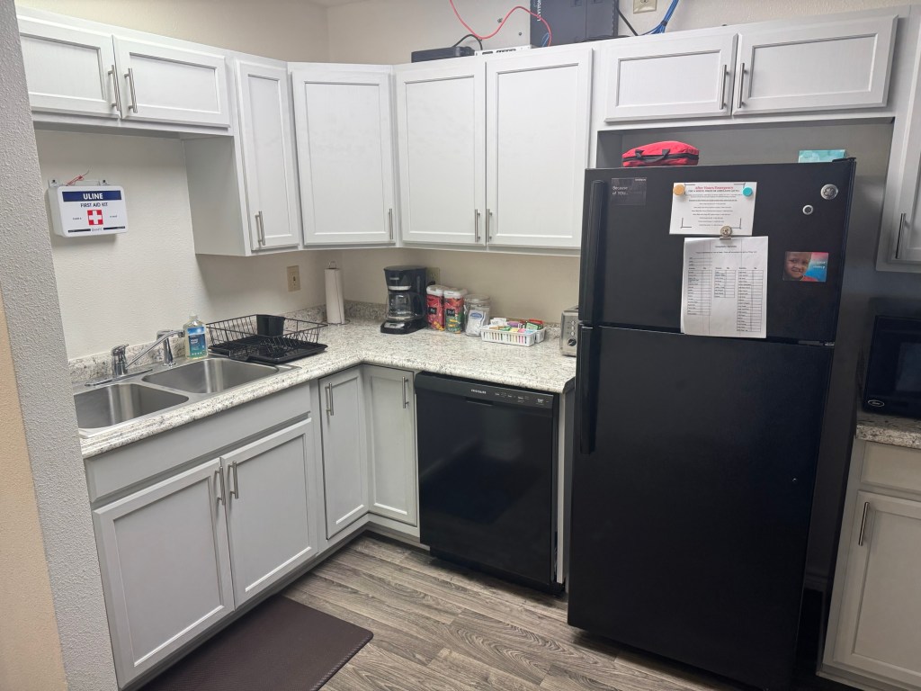 Each housing unit is fully stocked with breakfast items (eggs, bagels, cream cheese, English muffins, peanut butter, jelly, oatmeal, cereal & milk, coffee, tea, juice, water, etc). We eat at our “home” each morning.