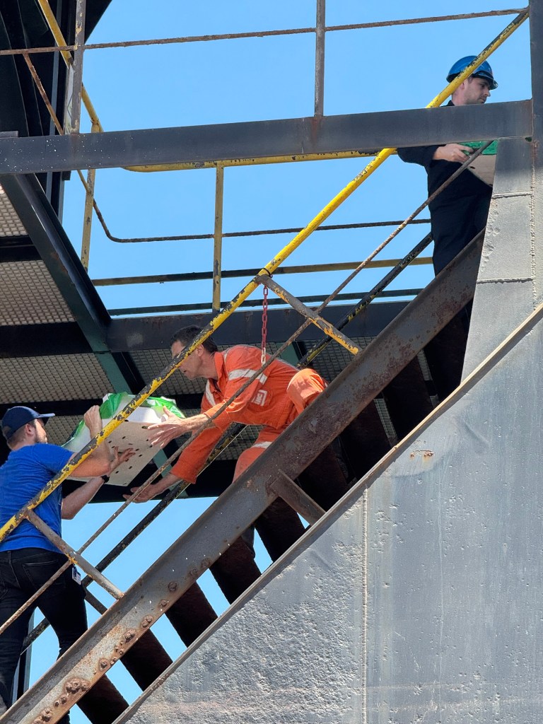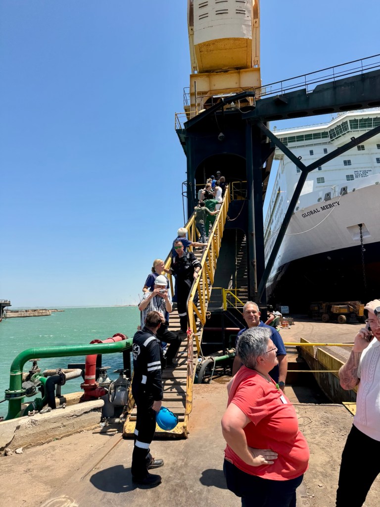 Another interesting thing happened today. We received a shipment (things like fresh food and medical supplies) but our crane is down so we had to carry a truck load up very steep dock-yard steps for 11 floors! Being the amazing people who fill the volunteer positions at Mercy Ships, we formed a chain of well over 100 people (looking like organized ants) and got the job done in the hot Spanish sun.