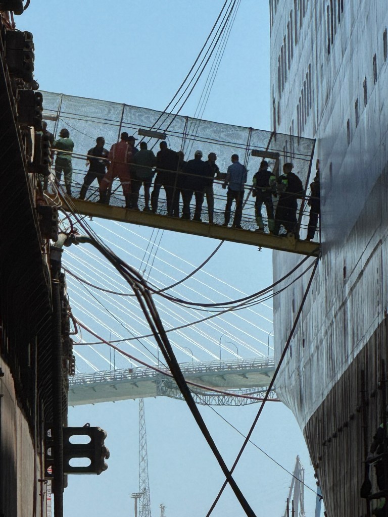 “UN-DOCKING” the world’s largest private hospital ship is a monumental task. I have mentioned that we are undergoing our annual maintenance (and that the ship is out of the water to complete that required 5-year inspection). Everything looks “GO” to slip back into the ocean tomorrow. It is a long, careful, process which will take about 12 hours. Last minute repairs were completed and we are getting her back into “ship shape”!